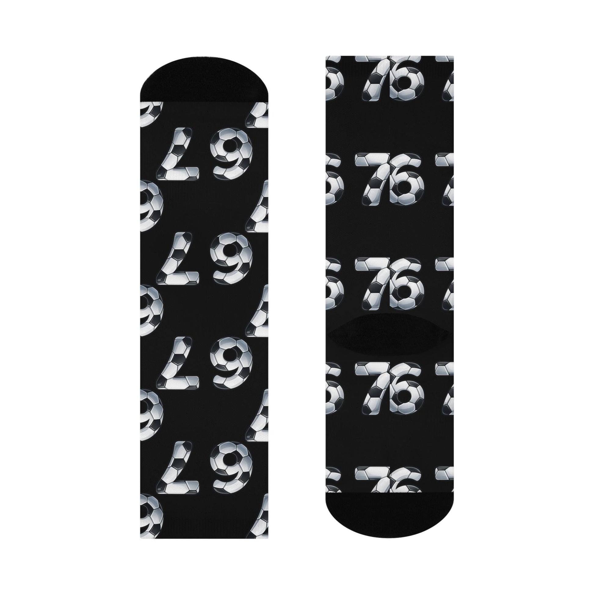 Kick back and lace up — these cushioned crew socks bring a playful, sporty edge to everyday wear. The black base makes the bold soccer-ball-style numbers pop, while the extra padding underfoot keeps feet happy through practice, school, or a weekend of running around. Stretchy, smooth fabric moves with the foot and holds bright, crisp prints wash after wash. They sit mid-calf for reliable coverage and pair easily with sneakers or slides. Wear them to training sessions, neighborhood games, or when you just want a little athletic attitude in your outfit.